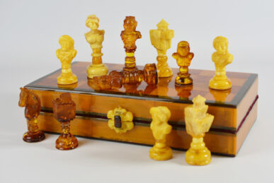 Set comes with original fine worked amber folding chess board the interior lined in velvet to store the pieces.