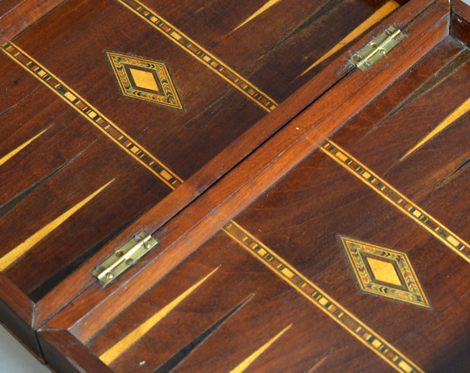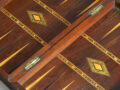 Set comes with similar period English chess board box, the exterior of mahogany with rosewood & boxwood inlaid chess board with parquetry inlaid border in various woods. The interior with inlaid backgammon board.