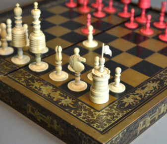 These fine detailed lacquer games boxes were made for the western market to compliment fine chessmen.