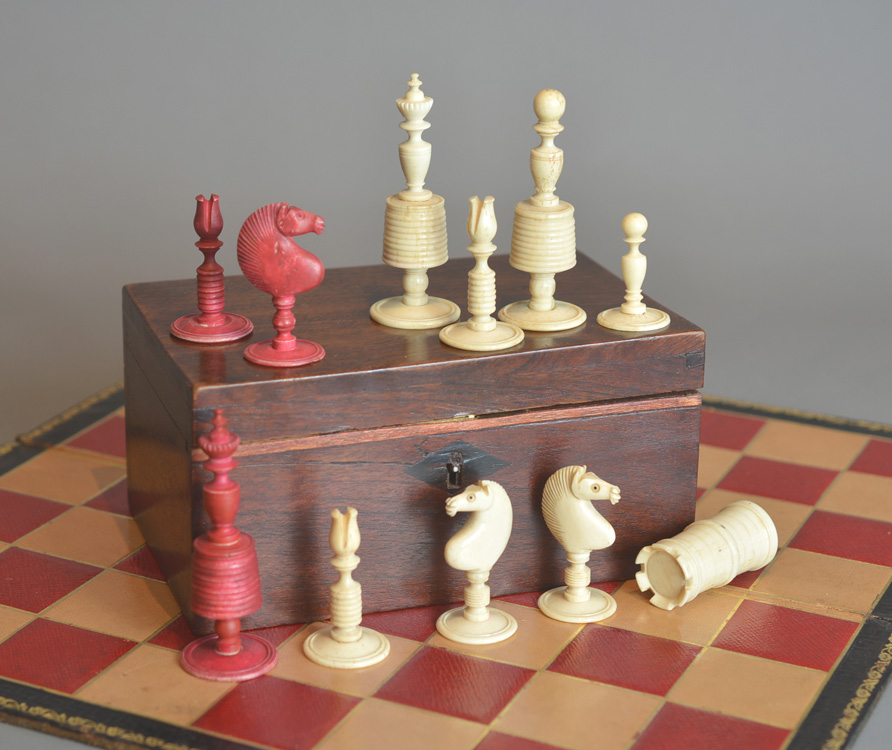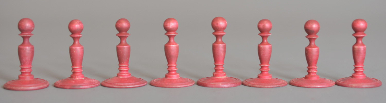 Fine turned & carved English bone chessmen one side stained red other side left natural.