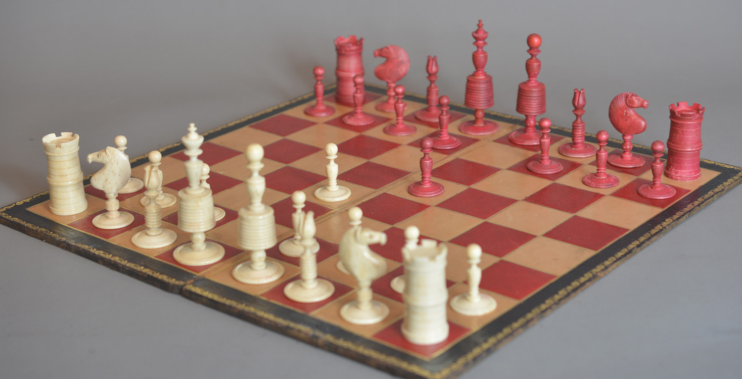 The chessmen come with Victorian English tooled leather chess board the squares in red & tan with gilt decorated borders.