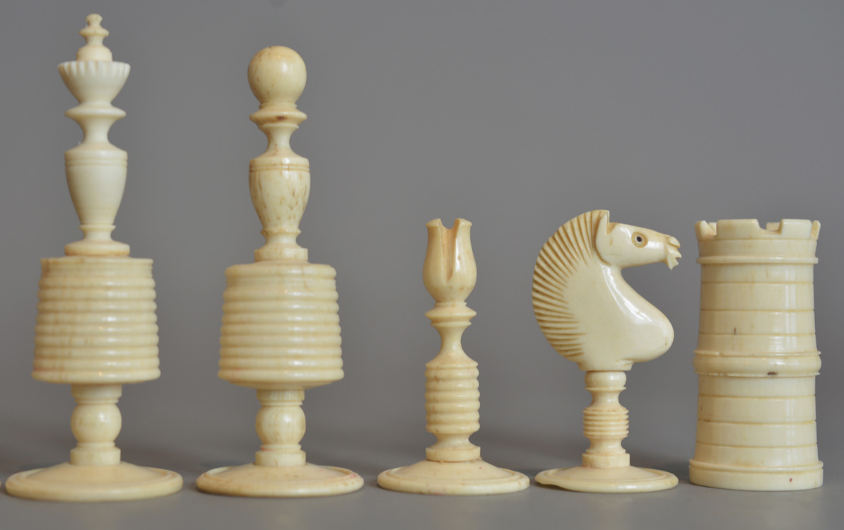 Pawns with urn shaped turned stems, knights as fine carved horses heads all typical of the period.