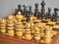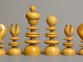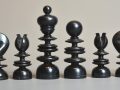 Fine ebony & boxwood playing set in the “St George” pattern. The bodies with multi turned decorated bodies & fine carved knights.