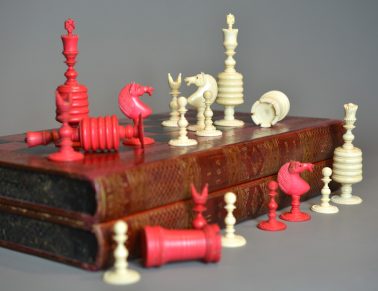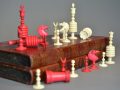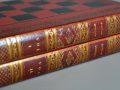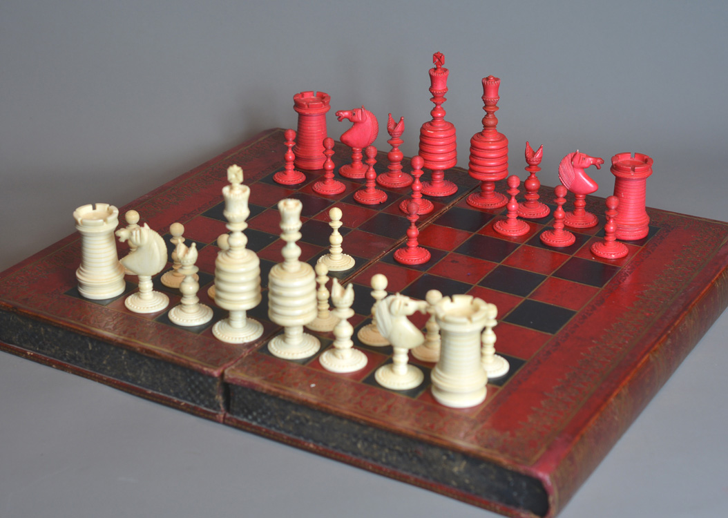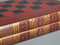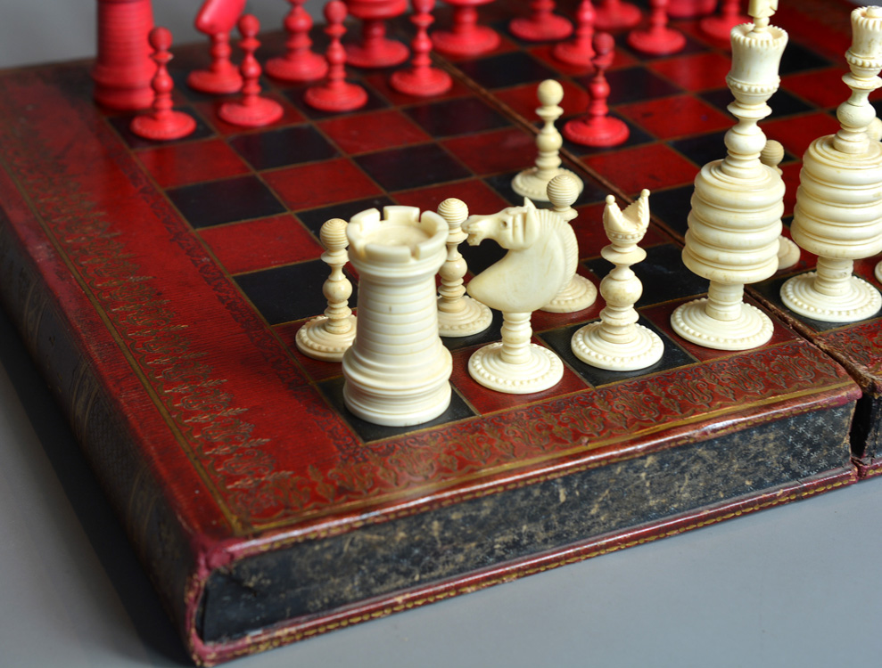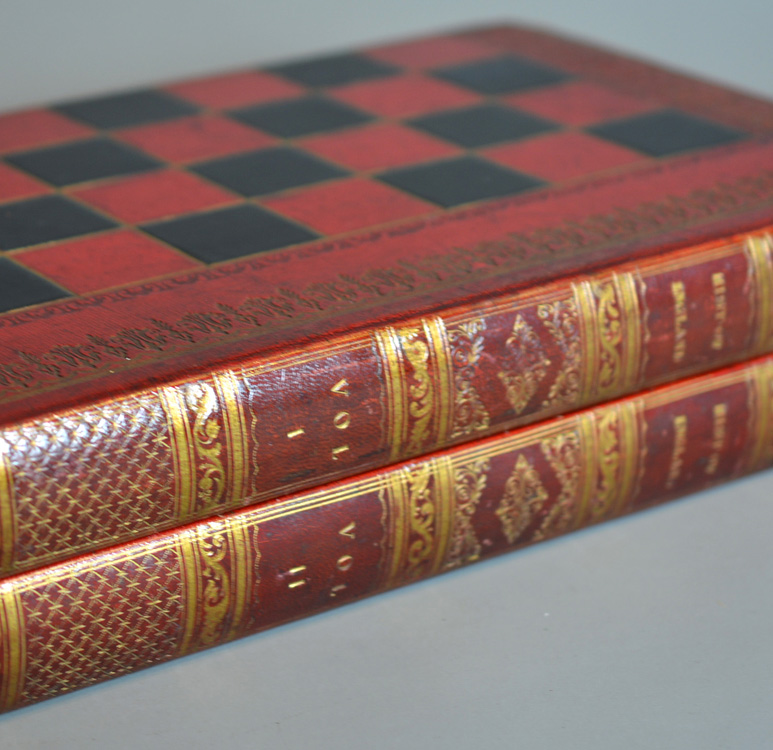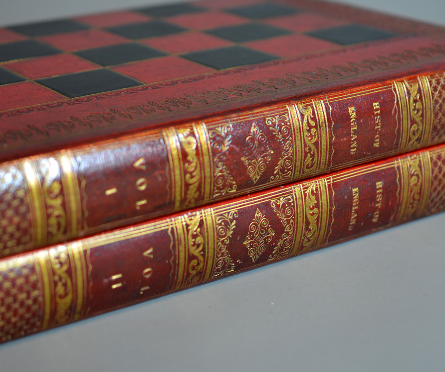 Chessmen come with same period English fine tooled leather folding games box , the exterior with tooled leather chess board and sides representing a book with elaborate gilt decorated spines inscribed “History of England” Vol 1 & 2.