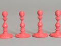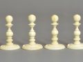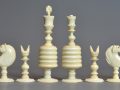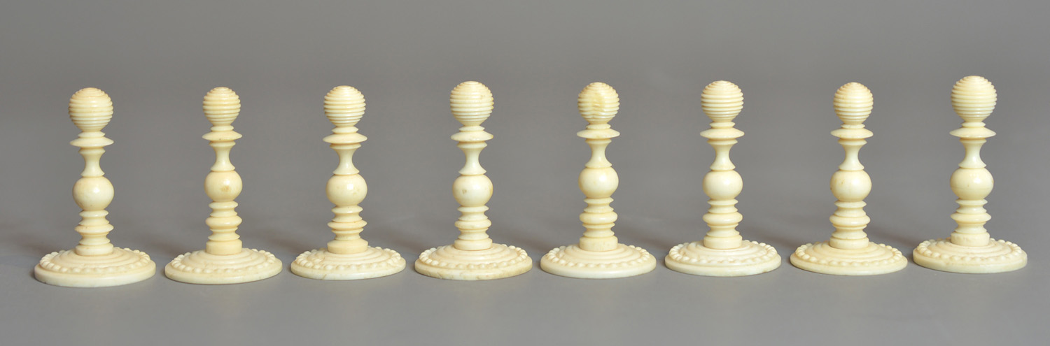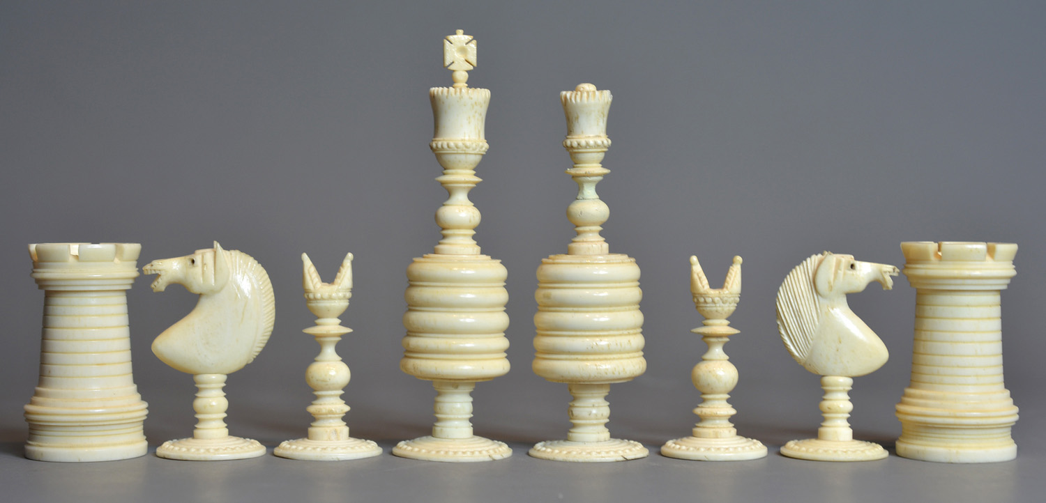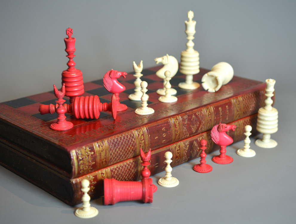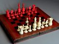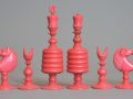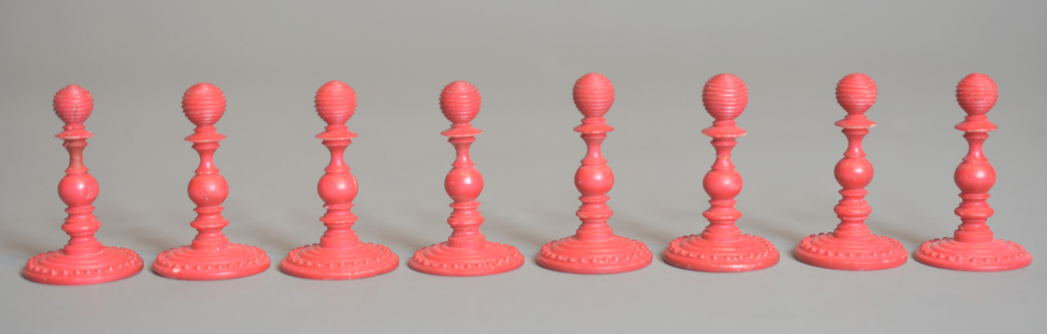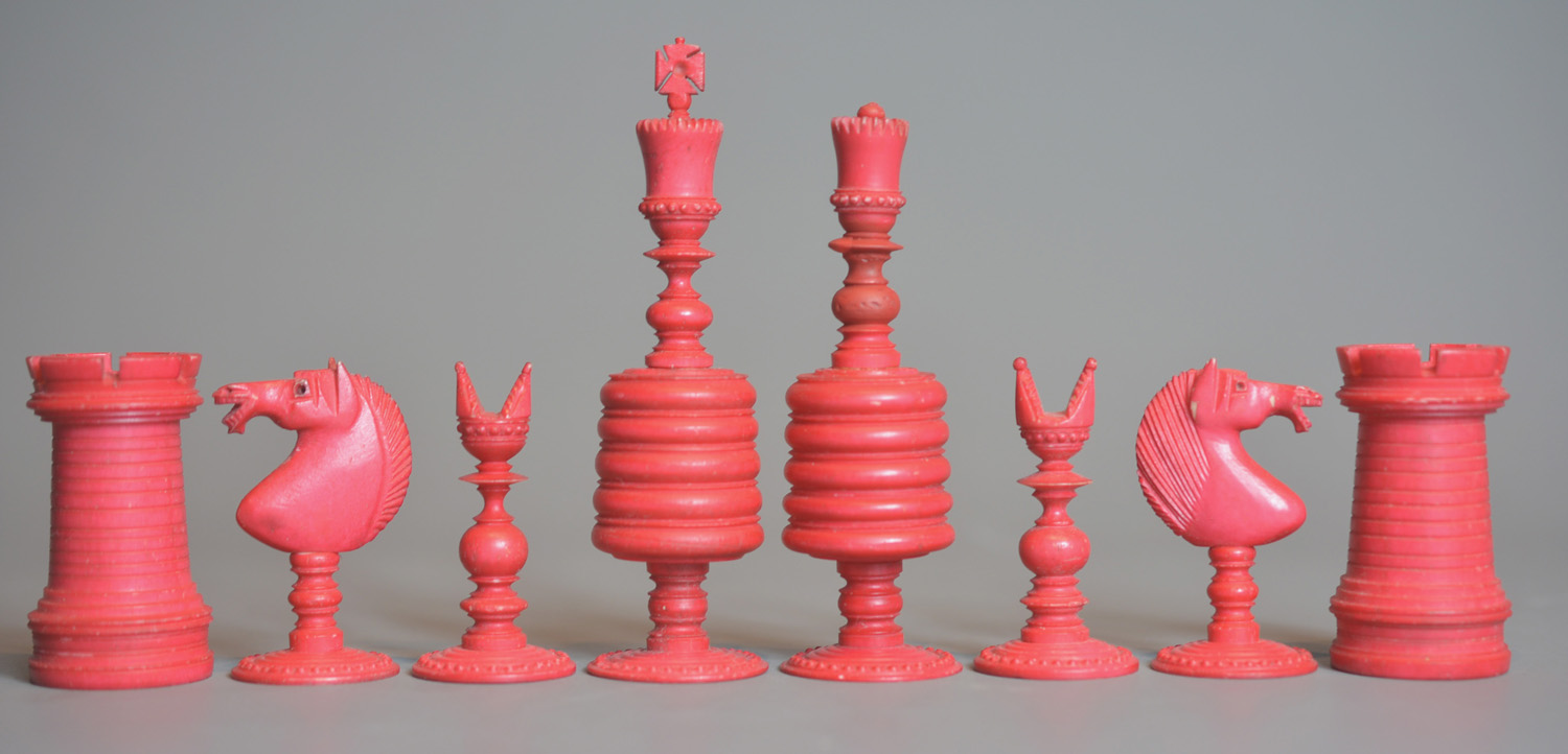 Large English turned & carved bone chessmen one side stained red other side left natural. The pieces with balluster turned stems , rooks as towers, knights with carved horse heads, the pieces with carved ball decoration to bases and the kings , queens and bishops with the same decoration to tops, Kings with maltese cross finials.