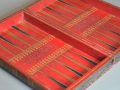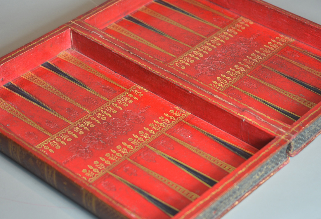 The interior with tooled leather backgammon board with gilt decoration.